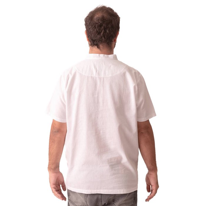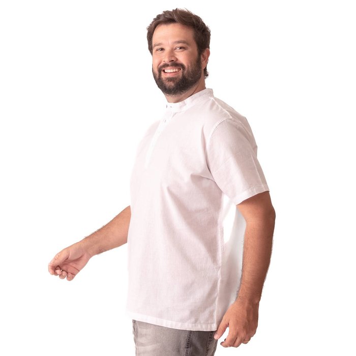 O modelo conta com gola padre moderna e fechamento frontal por botões até a altura do peito, criando um visual clean, sofisticado e contemporâneo. A manga curta garante leveza e praticidade, tornando a peça adequada tanto para ocasiões casuais quanto para eventos sociais leves.