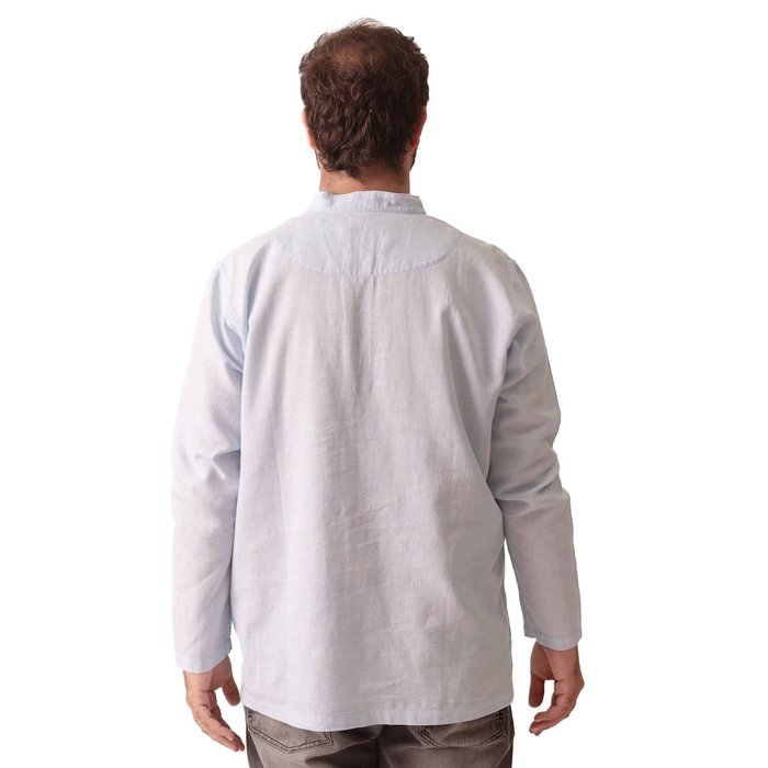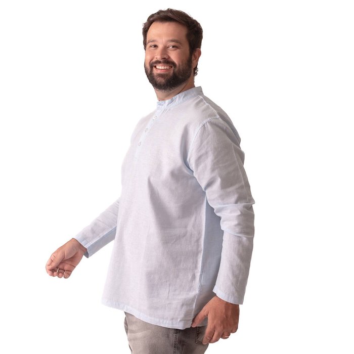 O modelo apresenta gola padre, com fechamento frontal por botões, geralmente até a altura do peito, garantindo um visual moderno, clean e atual. A manga longa reforça a proposta sofisticada da peça, sem perder o conforto, tornando-a menos formal que uma camisa social tradicional, porém mais refinada que uma camiseta.