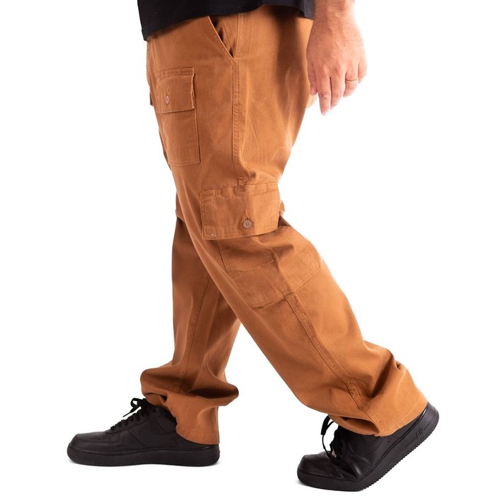 A peça conta com dois bolsos frontais tipo faca e cinco bolsos com lapela e botão, que aliam funcionalidade e estilo. Disponível nos tamanhos do G1 ao G10, é perfeita para o público Plus Size masculino que valoriza conforto e visual contemporâneo.