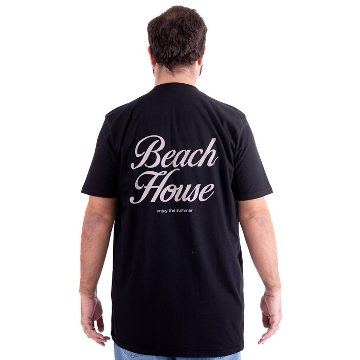 Com manga curta e gola redonda, a peça traz cor preta versátil e moderna. Na frente, possui uma pequena estampa localizada no lado esquerdo do peito, e nas costas apresenta uma grande estampa com o texto “BEACH HOUSE” e a frase “enjoy the summer”, inspirando um estilo leve e praiano.