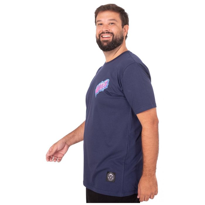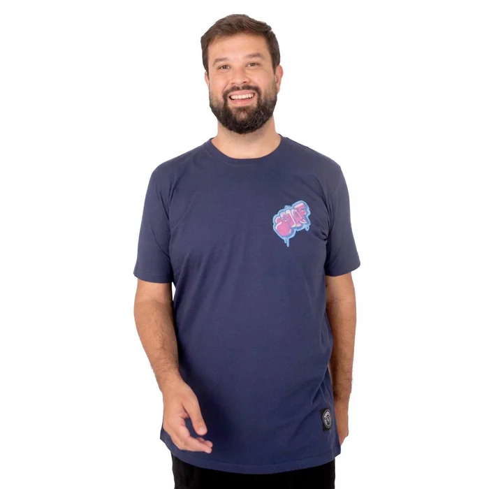 A cor azul marinho é clássica e versátil, facilitando combinações e tornando a camiseta ideal para composições casuais e urbanas com inspiração praiana.