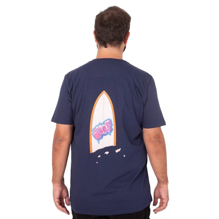 A peça traz, na parte frontal, uma estampa pequena e localizada com a palavra “SURF”, adicionando um detalhe discreto e moderno ao visual. Nas costas, possui estampa maior de uma prancha de surf acompanhada da palavra “SURF”, criando um visual marcante, despojado e cheio de personalidade.