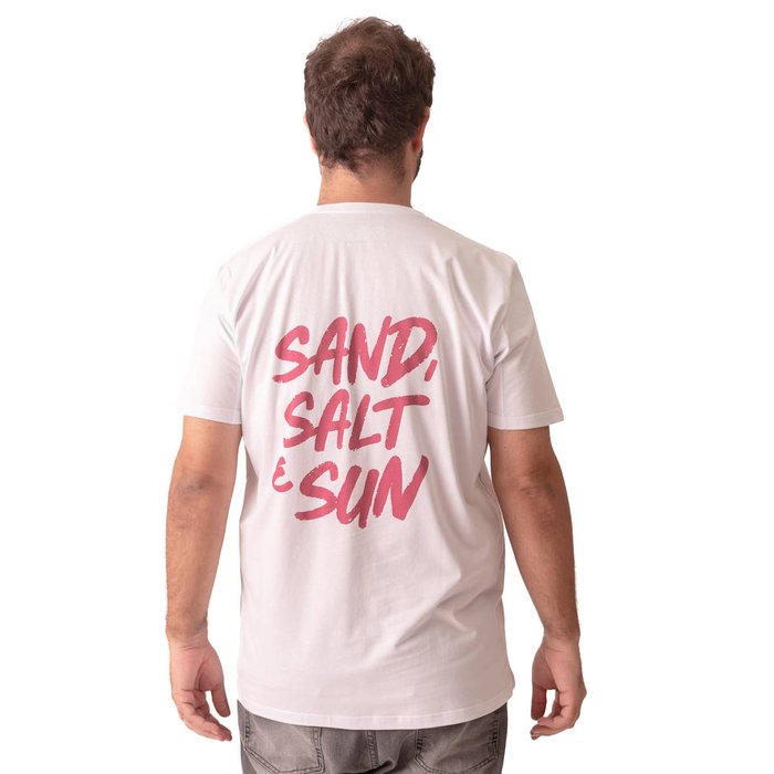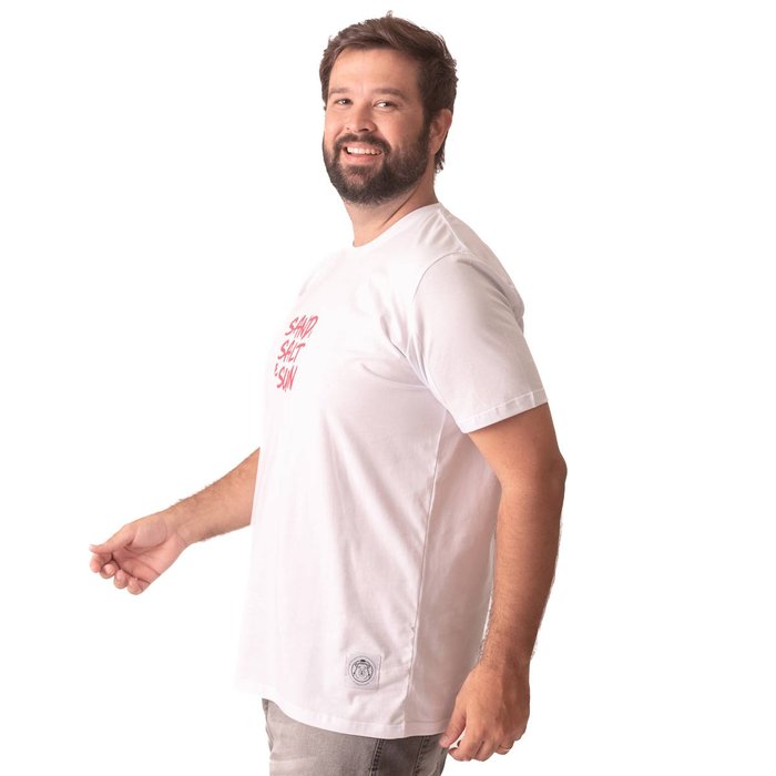 O modelo conta com estampa em destaque com a frase “SAND, SALT & SUN”, aplicada tanto na parte frontal quanto na parte traseira, reforçando um visual moderno, leve e descontraído. A gola redonda clássica e a manga curta garantem praticidade e versatilidade para diversas combinações.