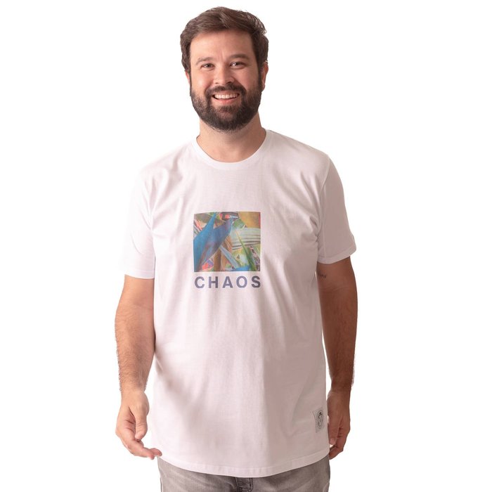 O grande destaque da peça está na estampa tropical em evidência, composta por folhagens e elementos gráficos com as palavras “CHAOS”, “WILDNESS” e “THE BEAUTY OF CHAOS”, aplicadas tanto na parte frontal quanto na parte traseira, criando um visual moderno, urbano e impactante.